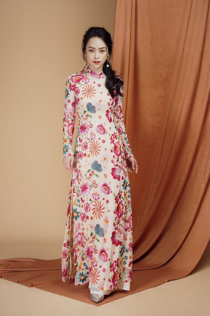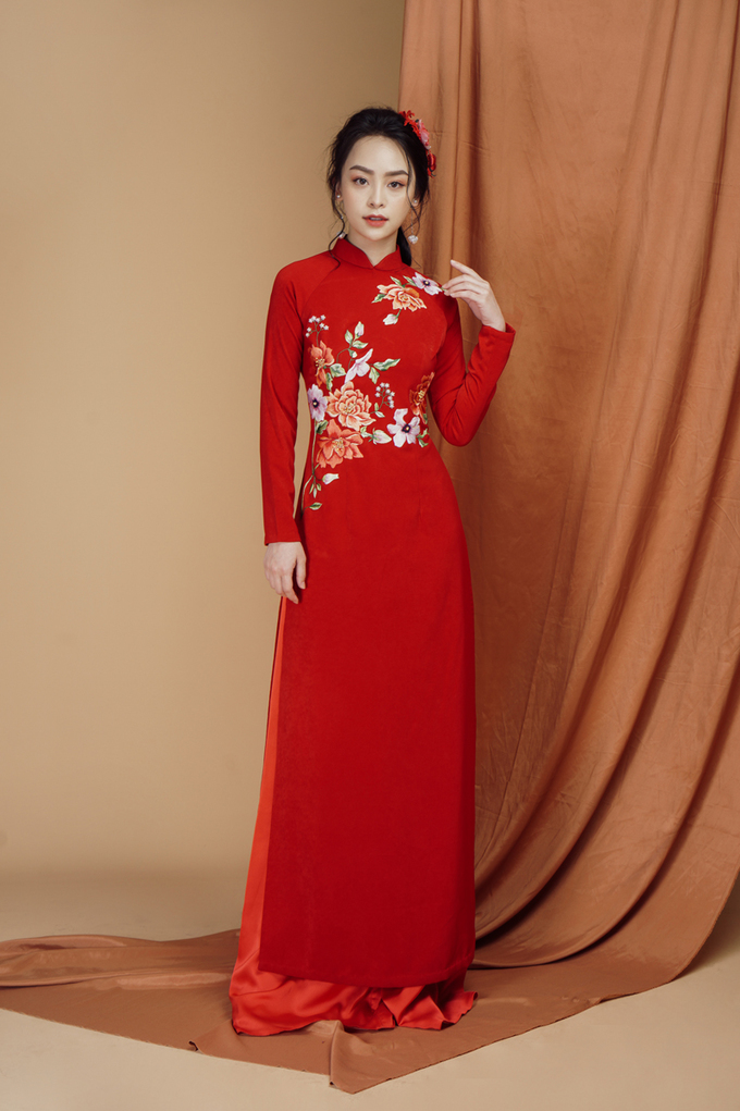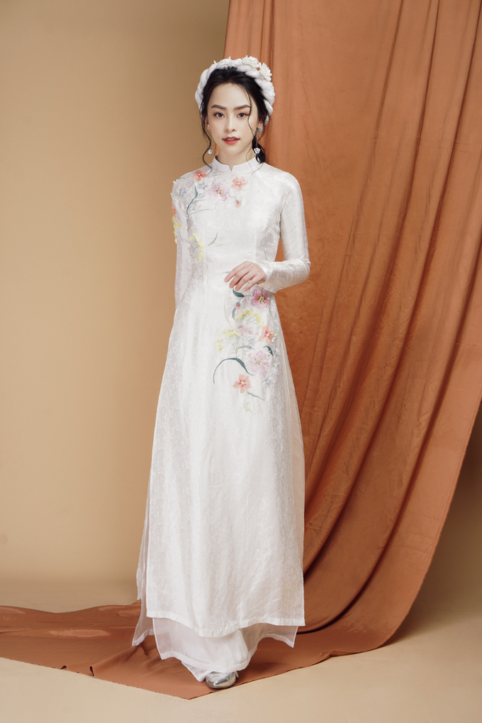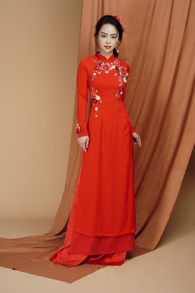 Áo dài thêu và đính hoa 3D không chỉ thích hợp cho tân nương để diện trong ngày hạnh phúc mà còn có thể tái sử dụng vào nhiều dịp trong năm.