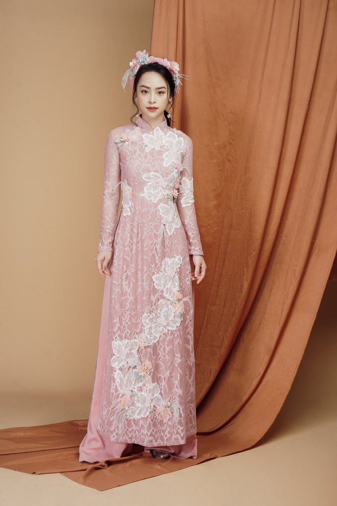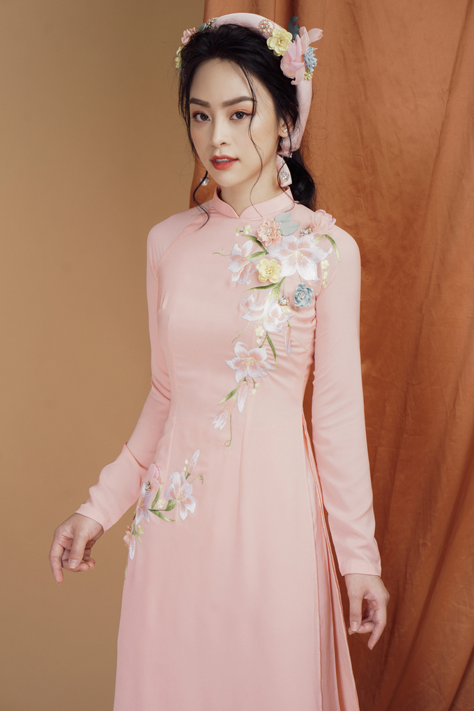 Áo dài màu hồng pastel được điểm họa tiết hoa 3D theo hình chữ S tạo cảm giác về một thân hình mảnh dẻ, tôn lên sự nữ tính của người con gái.
