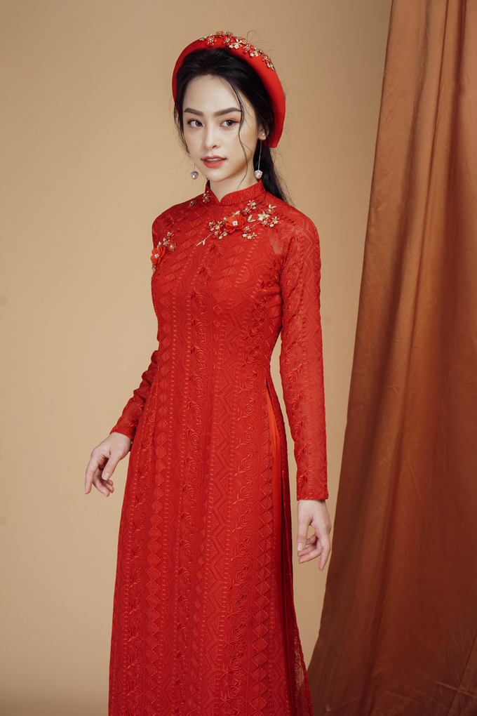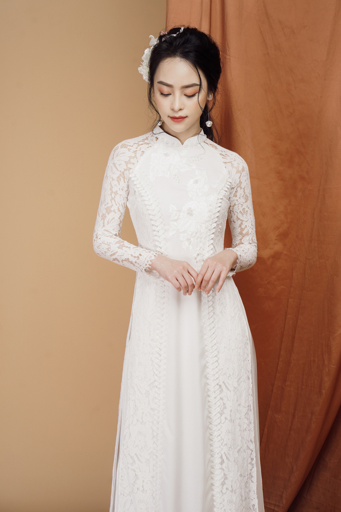 Mẫu áo dài ren được thêu hoa trắng trên ngực tô thêm nét đẹp tinh khôi, e ấp của nàng dâu mới. Dải dây leo chạy dọc thân giúp kéo dài chiều cao cơ thể của người mặc.