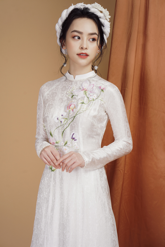 Áo dài trắng tinh khôi là lựa chọn tiếp theo dành cho bạn gái trong dịp hỷ sự. Họa tiết thêu được chạy chéo từ cầu vai đến eo tạo nét duyên dáng cho cô dâu mới.
