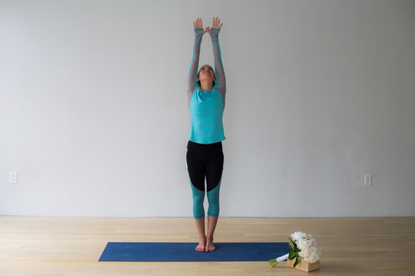 - Khép chân, bấm nhẹ bàn chân trên thảm để tạo nên nền tảng vững chắc. Giơ hai tay lên trời, lòng bàn tay mở, hướng về phía trước.