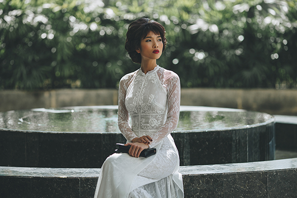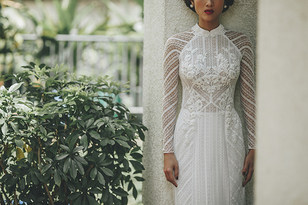 Mẫu áo dài cách tân lấy cảm hứng từ váy cưới với cách xếp ren lượn sóng đặc biệt.