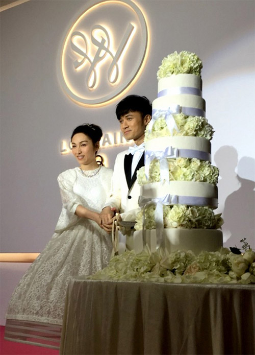 Tiệc cưới của Cổ Cự Cơ và Trần Ánh Tuyết tổ chức tại khách sạn Four Seasons Hồng Kông gây chú ý với chiếc bánh cưới phủ nhiều tầng hoa tươi.