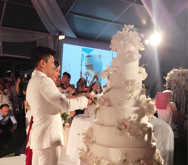 Mỹ nhân TVB, Hồ Hạnh Nhi và chú rể Philip Lee hạnh phúc bên chiếc bánh 6 tầng trắng tinh khôi trong đám cưới 'khủng' tại khách sạn Ritz Carlton.