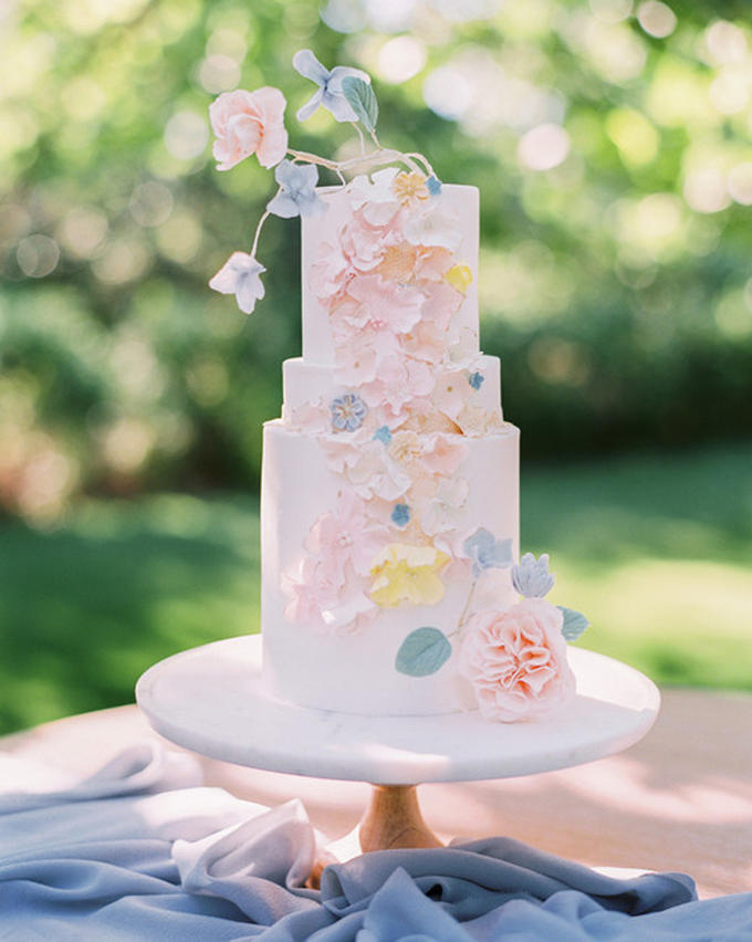 Bánh được nhấn nhá bởi sắc màu pastel và các loại hoa làm từ kem sẽ dành cho những người có niềm đam mê nghệ thuật. Một chiếc bánh cưới đẹp không chỉ gây ấn tượng bởi vẻ ngoài mà còn cần phù hợp với không gian xung quanh. Do đó, bạn nên chọn kích cỡ, hoa trang trí bánh phù hợp với concept chung của tiệc cưới.