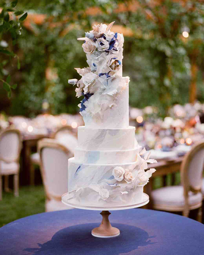 Hai tầng bánh micro-tier màu trắng xen giữa các tầng bánh màu xanh làm mờ ranh giới giữa thực và ảo, giúp các tầng bánh như lơ lửng giữa không trung. Cô dâu chú rể thích sự phá cách chắc hẳn sẽ khó lòng từ chối mẫu bánh mang tông pastel.