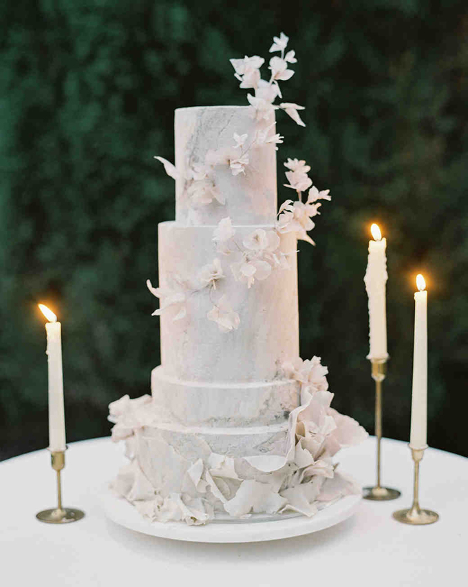 Sự kết hợp giữa các tầng bánh nake-cake (phủ ít kem tươi bên ngoài) và bánh có lớp phủ vân đá cẩm thạch tạo sự phá cách, độc đáo. Bánh được điểm thêm các loài hoa mùa xuân mang đến sự ngọt ngào, lãng mạn.