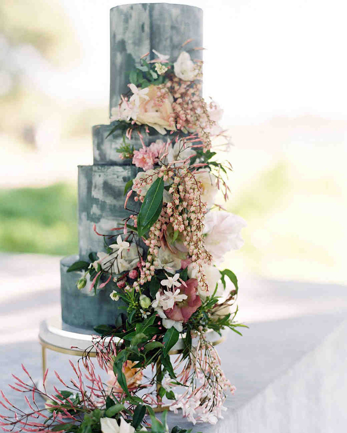 Chiếc bánh được phết màu xám đậm tựa những vệt màu của người họa sĩ, đóng vai trò là điểm nhấn ấn tượng cho ngày hạnh phúc của uyên ương. Mẫu bánh này dễ dàng phù hợp cho đám cưới rustic hoặc đám cưới hướng đến sự hiện đại.