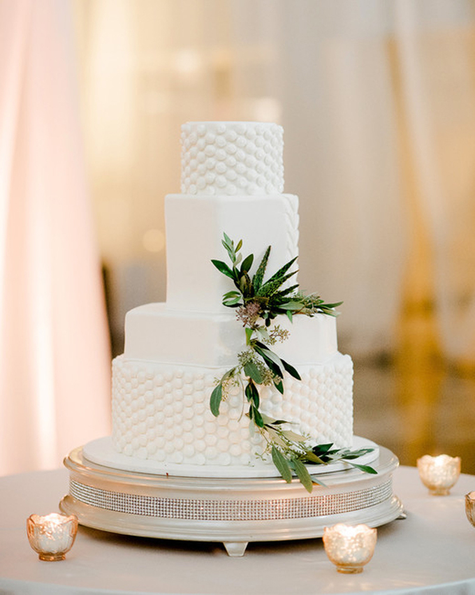 Tầng bánh tròn kết hợp tầng đa giác sẽ giúp chiếc bánh cho hôn lễ tối giản tránh cảm giác nhàm chán, đơn điệu. Uyên ương có thể điểm thêm nhành lá cây để tạo sự gần gũi với thiên nhiên.