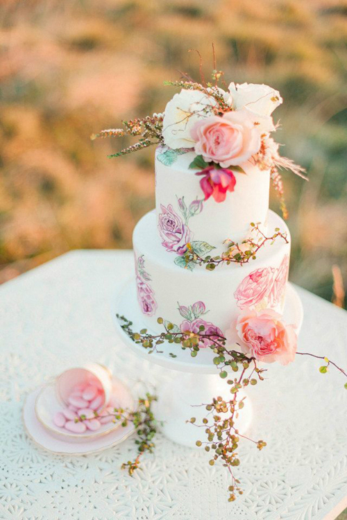Bánh cưới vẽ tay với họa tiết hoa lá mùa thu đẹp dịu dàng
