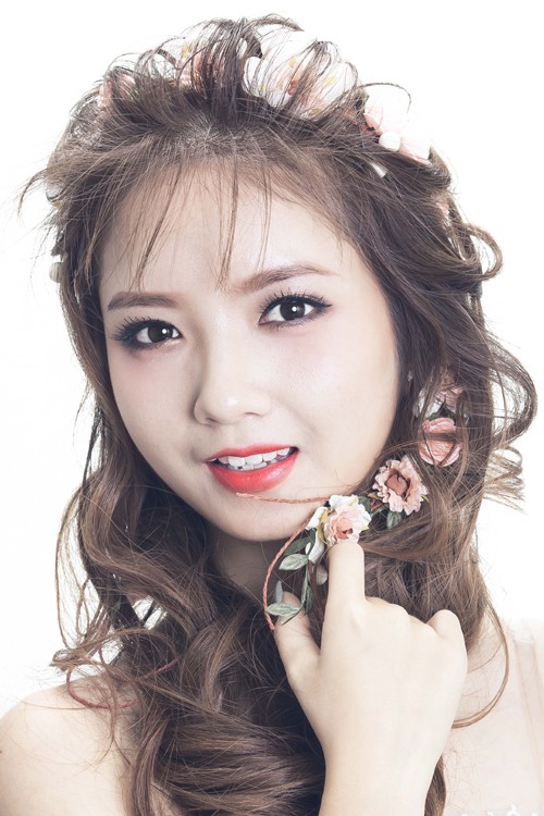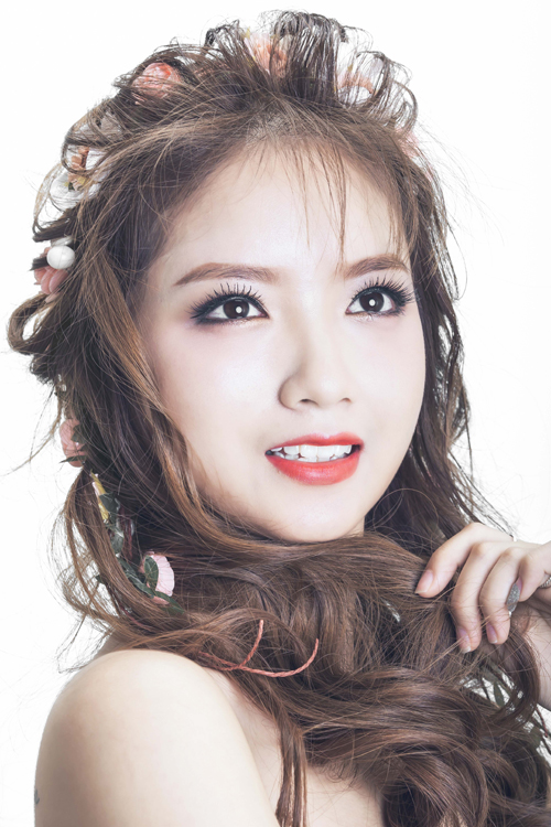 Cô dâu có khuôn mặt tròn, sống mũi thấp nhưng các nét khá hài hoà và dễ thương. Khi trang điểm không nên chọn kem nền có tông màu sáng hơn da vì chúng sẽ làm gương mặt trông to hơn. Tông màu tự nhiên hay tối màu hơn da một tông sẽ là sự lựa chọn hoàn hảo.