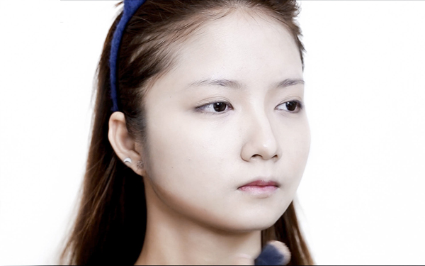 Chuyên gia trang điểm sử dụng kem nền tạo khối gam màu tối, tán nhẹ và đều tay ở phần khung xương hàm và gò má. Cách này tạo lại khối cho gương mặt, giúp khuôn mặt tròn của cô dâu trở nên nhẹ nhàng, thanh thoát hơn.