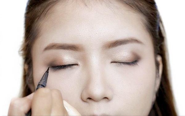 Đôi mắt là điểm nhấn quan trọng trên khuôn mặt nên cần được trang điểm tỉ mỉ, kỹ càng. Để tạo chiều sâu cho đôi mắt, chuyên gia dùng phấn màu nhũ ánh kim làm nền và nhấn nhẹ nhàng ở đuôi mắt bằng phấn nâu.