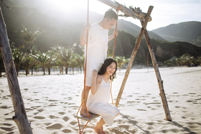 Uyên ương chụp hình tại nhiều địa điểm nổi tiếng như: Eo Gió, đồi cát Phương Mai, Kỳ Co, homestay ở Tuy Hòa. Do không xem thời tiết trước lúc đến Điệp Sơn nên uyên ương không lường được cơn mưa đến bất chợt.