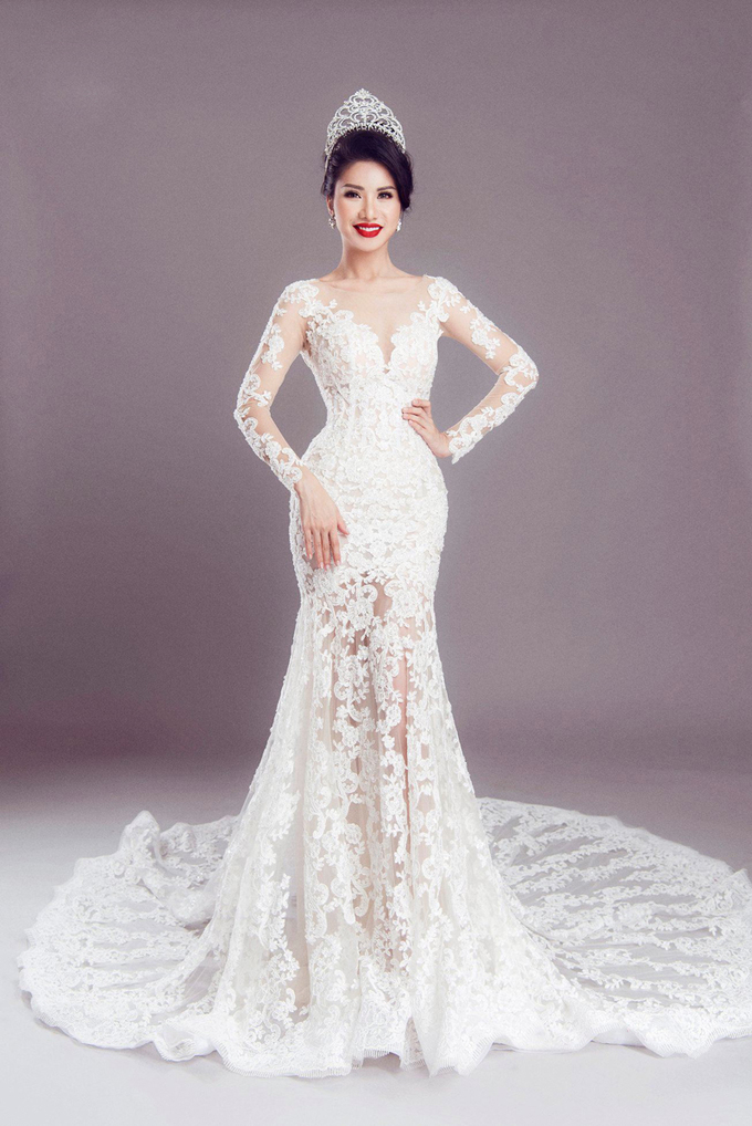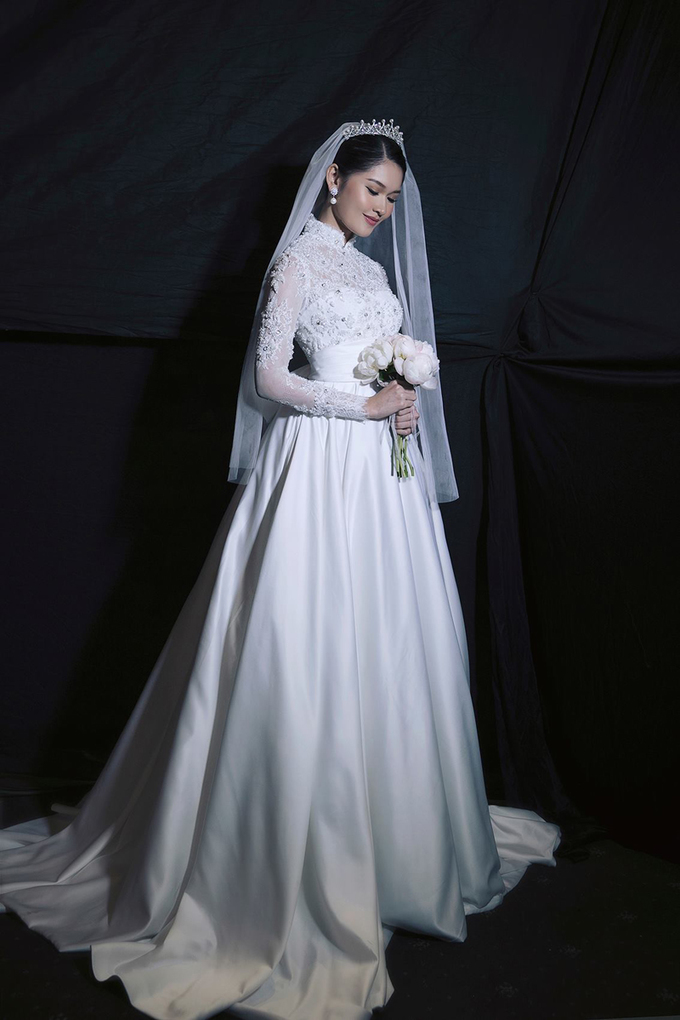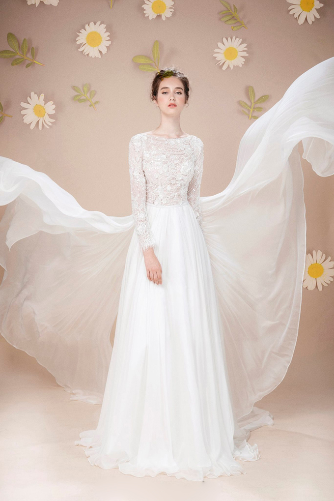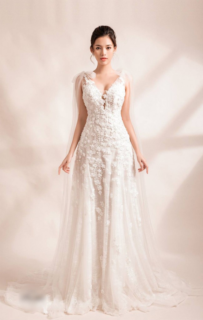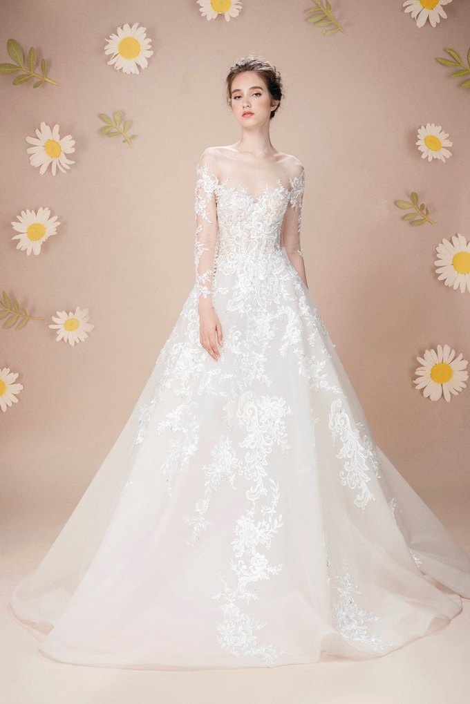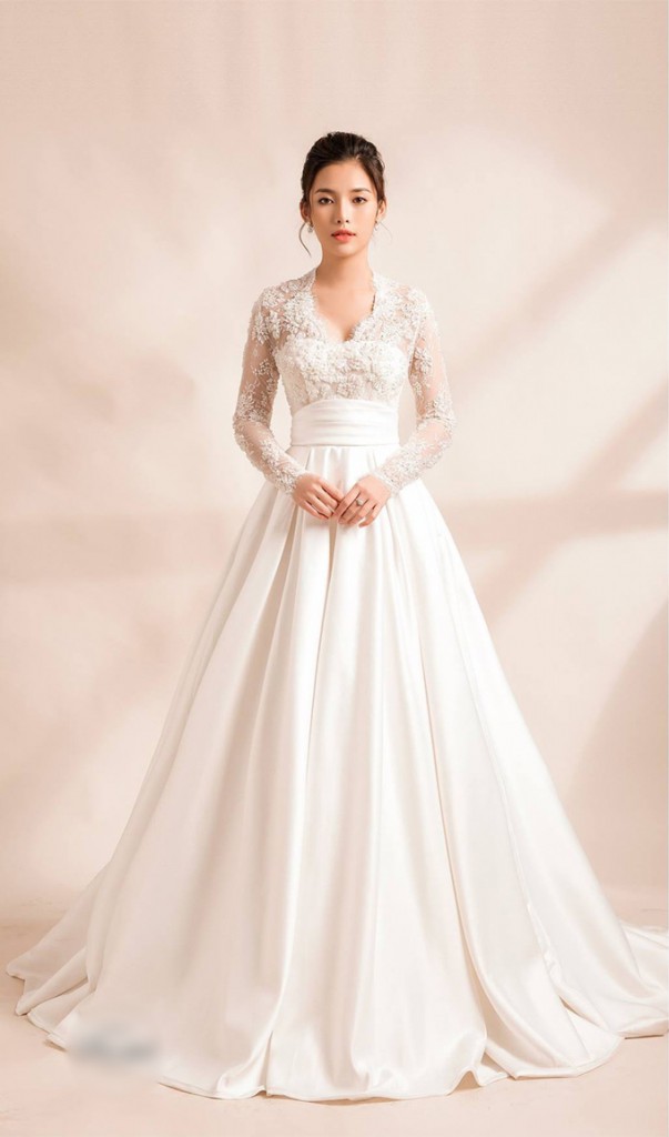 Nếu bắp tay không mấy thon gọn, cô dâu cần chọn thiết kế tay áo lửng, áo dài tay được thêu ren, may ôm để che lấp khuyết điểm vóc dáng.