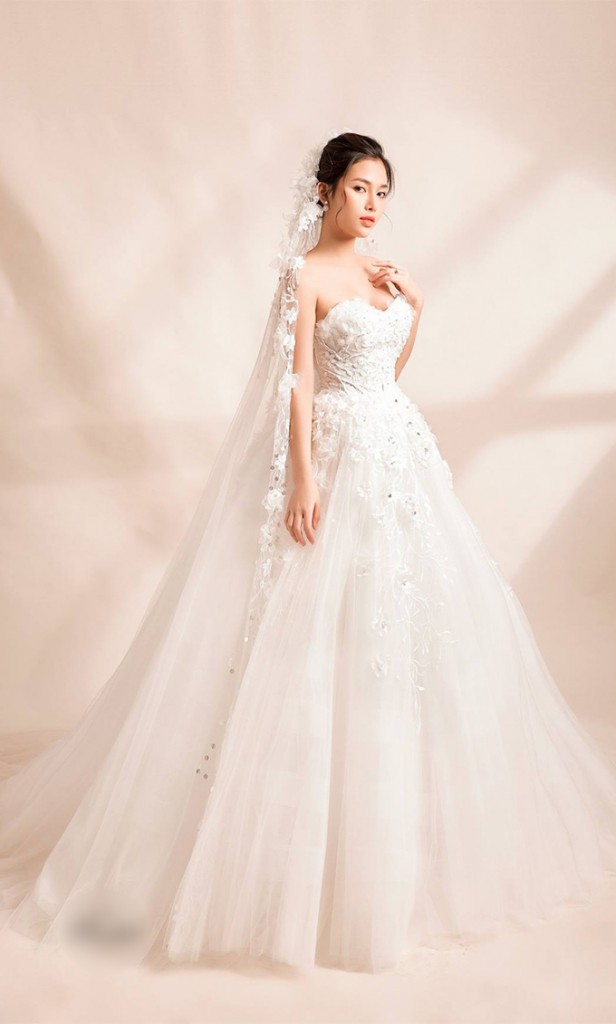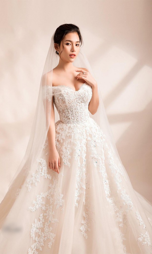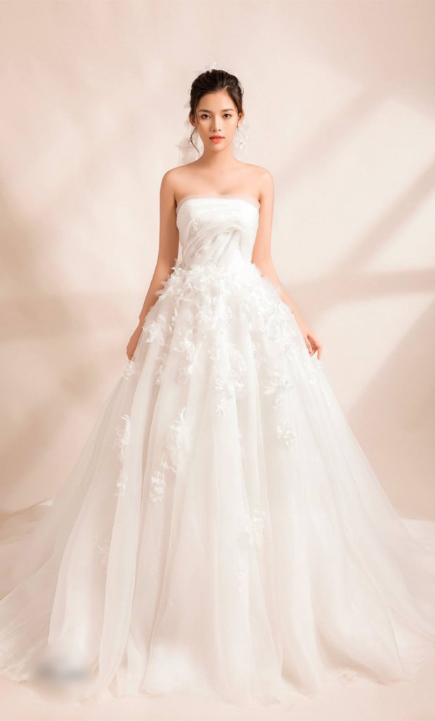 Váy xòe phồng công chúa là gợi ý tuyệt vời cho nàng dâu vì không kén dáng. Tuy nhiên, bạn lưu ý không chọn váy có tùng quá rộng, khiến vòng hai trở nên kém thon gọn.