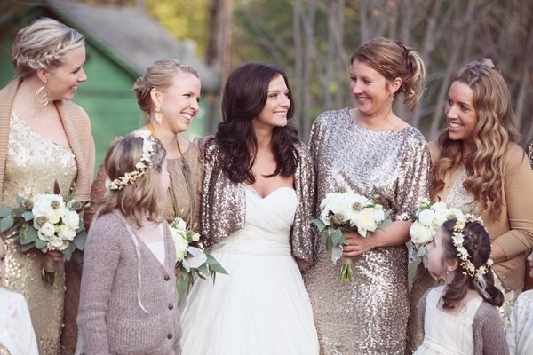 Cách nhanh nhất để tạo vẻ lộng lẫy là nhờ đến sự trợ giúp của các phụ kiện đính lông thú hoặc sequins lấp lánh. Lông thú mang đến sự ấm áp và tạo cảm giác hoang dã, sang trọng. Bên cạnh đó, sequins mang đậm không khí lễ hội, tiệc tùng, phù hợp với đám cưới cuối năm. Có rất nhiều màu sắc ánh kim từ vàng đồng, trắng bạc, hồng tới những gam màu lấp lánh ấn tượng. Phù dâu có thể diện gam màu đồng điệu với tông chủ đạo trang trí đám cưới hoặc theo sở thích của cô dâu.