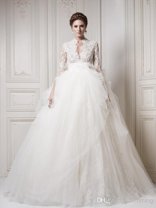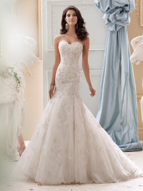Cô dâu có bộ ngực nhỏ muốn tạo cảm giác ngực đầy đặn, gợi cảm hơn nên chọn váy cưới có phần ngực nhấn nhá đường viền và đính họa tiết đá, ren.