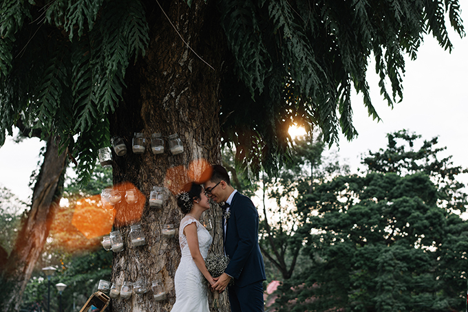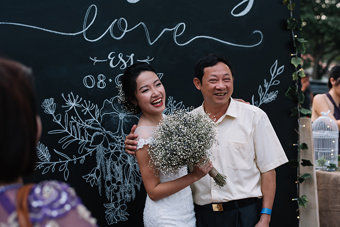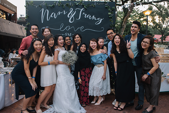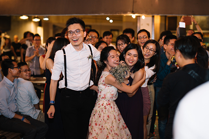 Trong ngày vui diễn ra ở Việt Nam, khách mời của họ là họ hàng, bạn bè của bố mẹ và bạn học cũ. Ở Singapore, đôi uyên ương đã có một đám cưới ấm cúng, rộn rã tiếng cười với khách mời là đồng nghiệp và bạn bè thân thiết.