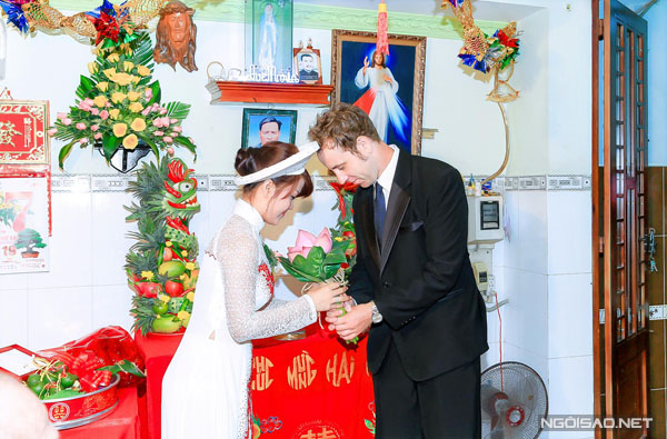 Như Phụng và Dorje trong lễ ăn hỏi theo phong tục Việt Nam.