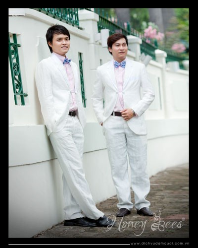 Nam bưng quả sơ mi trắng, nơ, dây đeo lịch lãm