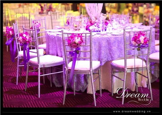 Những chiếc ghế tiffany được trang trí hoa nơ và hoa tươi nhẹ nhàng sang trọng theo tông màu tím hồng