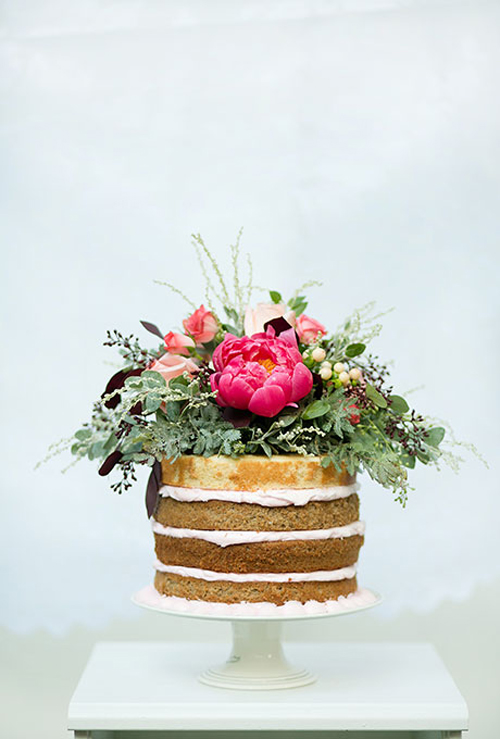 Những chiếc bánh màu gỗ mộc mạc (naked cake), không dùng kem trang trí mà được tô điểm bằng nhiều loại hoa lá nhẹ nhàng.