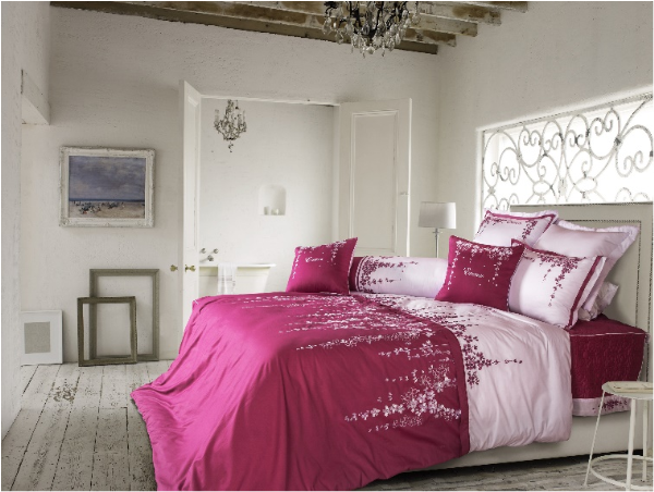 Một bộ chăn ga gối màu hồng đậm hay đỏ sẽ mang lại cảm giác ấm áp cho căn phòng.