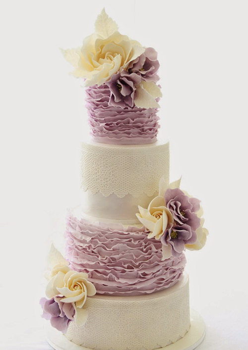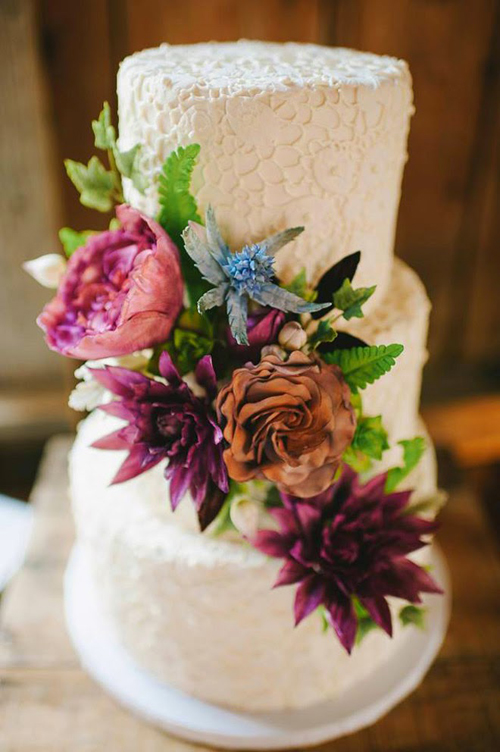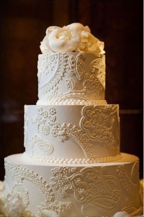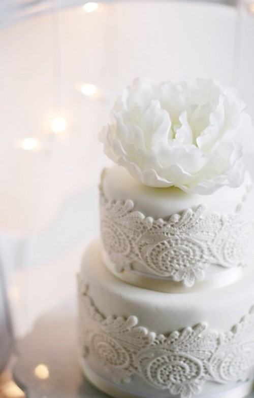 Những chiếc bánh cưới màu trắng sẽ không còn nhàm chán khi được nhấn nhá với họa tiết ren nổi.