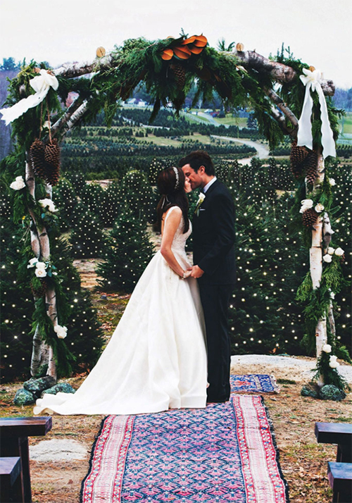 Đám cưới của cặp đôi diễn ra ở ngoài trời, với cách trang trí đơn giản. Cổng hoa được thay thế bằng chiếc cổng gắn lá thông và quả thông thể hiện không khí Giáng sinh lãng mạn.