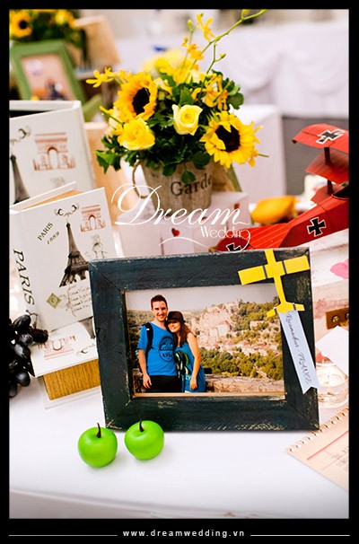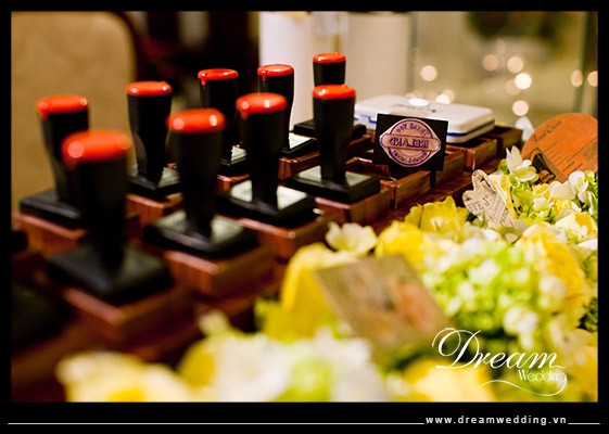 Cô dâu chú rể chuẩn bị những con dấu khắc tên từng nước. Mỗi khách mời tới dự tiệc sẽ được xếp chỗ ngồi theo bàn tiệc mang tên nước và được đóng dấu mộc vào tay.