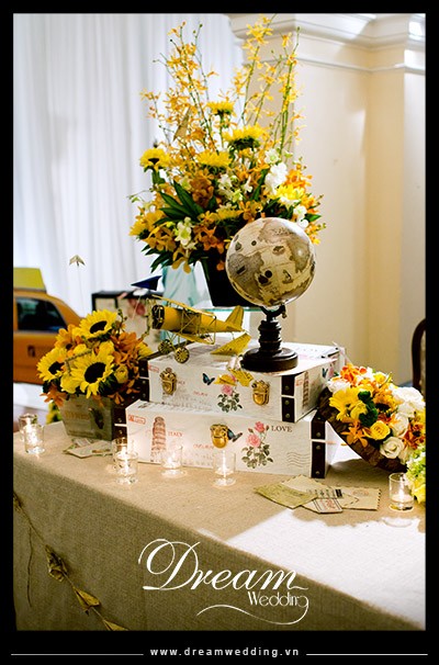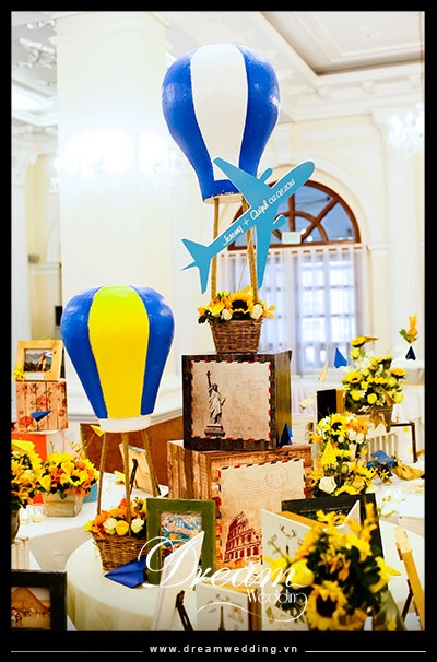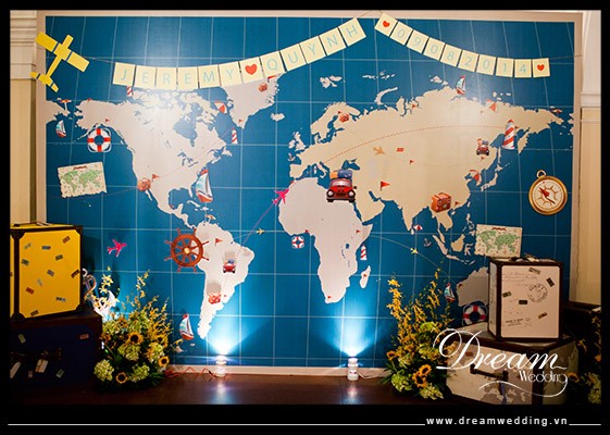 Chủ đề của đám cưới là du lịch với sắc màu chủ đạo là trắng - vàng và xanh navy. Mọi khu vực trong tiệc, từ ngoài sảnh tới khu vực đón khách, khu vực tiệc cocktail và nơi đãi tiệc đều được trang trí với các phụ kiện liên quan như bản đồ, hình ảnh các địa điểm du lịch nổi tiếng, valy, quả địa cầu... Tất cả tổng thể hài hòa, nhất quán để thể hiện rõ phong cách và chủ đề đám cưới. Ngoisao.net sẽ giới thiệu đám cưới thú vị này, hy vọng đó sẽ là nguồn cảm hứng để uyên ương tương lai lên kế hoạch cho hôn lễ của mình.