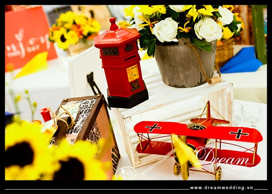 Bàn tiếp tân cũng không thể thiếu những phụ kiện theo chủ đề travel như postcard đáng yêu.