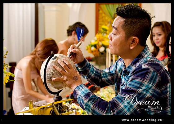 Khách mời ký tên lên quả địa cầu như một kỷ niệm khó quên dành cho cô dâu chú rể. Cặp đôi cũng có thể giữ lại quả địa cầu này để trang trí trong ngôi nhà và gợi nhớ về đám cưới ấn tượng.