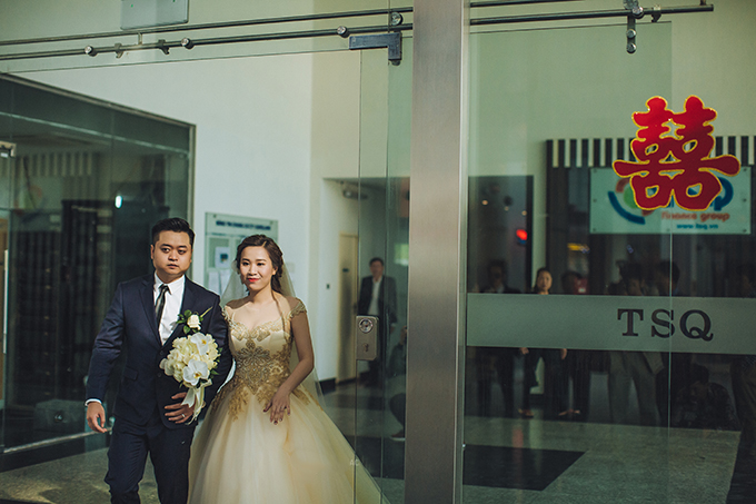 Cô dâu Hồng Trang xuất hiện rạng rỡ trong bộ soiree màu be điểm ren ánh kim của nhà thiết kế Lek Chi. Chuyên gia trang điểm Dũng Nguyễn chọn cho cô dâu phong cách make up căng mọng, tràn đầy sức sống.