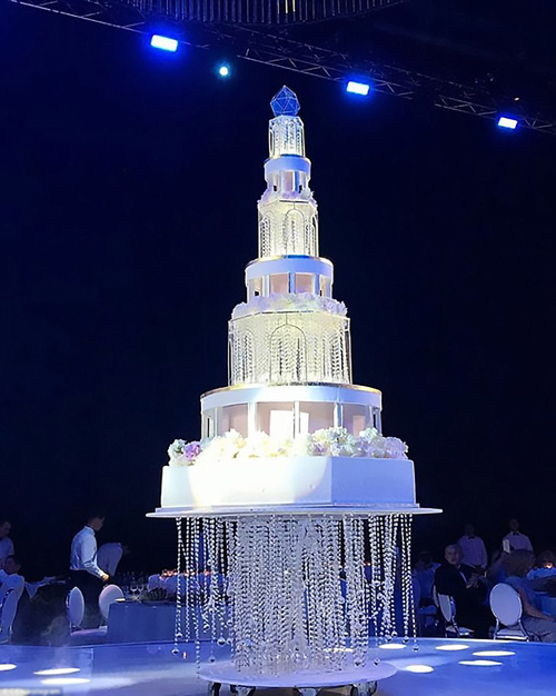 Chiếc bánh cưới 8 tầng đính pha lê là điểm nhấn trong bữa tiệc.