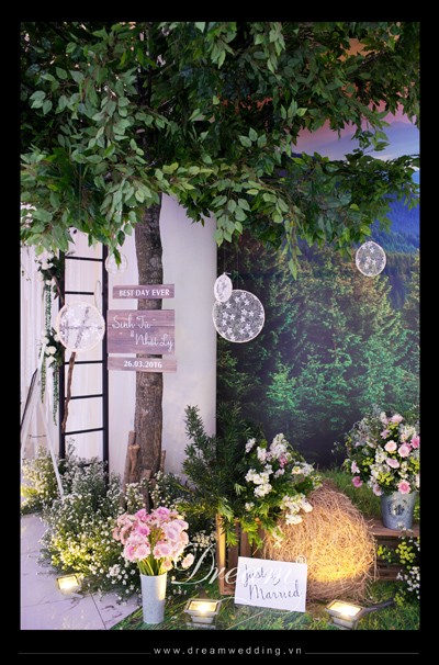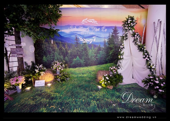 Trang trí tiệc cưới tại Adora Q5, trang trí đám cưới - phông chụp hình tái hiện lại 1 góc núi rừng nơi anh chị đã từng đi qua