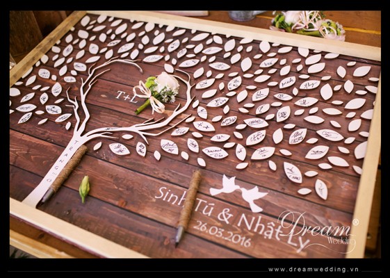 Trang trí tiệc cưới tại Adora Q5, trang trí đám cưới - sổ ký tên hình những chiếc lá để lưu lại chữ ký của những người thân