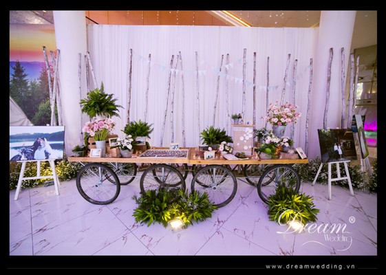 Trang trí tiệc cưới tại Adora Q5, trang trí đám cưới - bàn ký tên và gallery chung với nhau đặt trên xe gỗ, phía sau là phông voal và những hàng cây gỗ