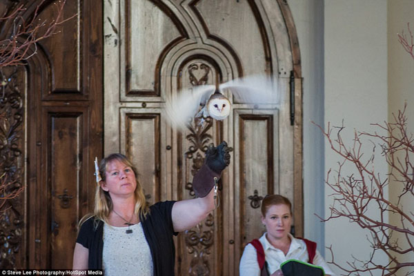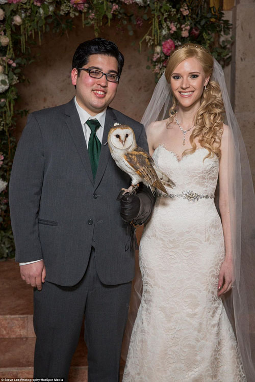 Đám cưới theo style phù thủy không thể thiếu sự góp mặt của những chú cú xinh xắn, biểu tượng cho bóng đêm và sự bí ẩn. Trong tiệc cưới của Stephanie và Samuel, chú cú này có nhiệm vụ giao đôi nhẫn cưới đến tận tay cô dâu, chú rể.