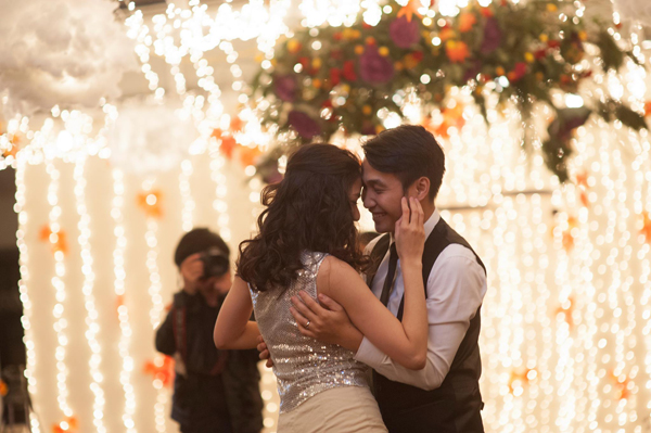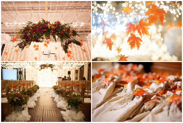 Cả khán phòng được thắp sáng bởi hàng trăm dây đèn fairy tượng trưng cho những tia nắng. Lá phong vàng cũng được sử dụng để mang sắc thu vào bữa tiệc.