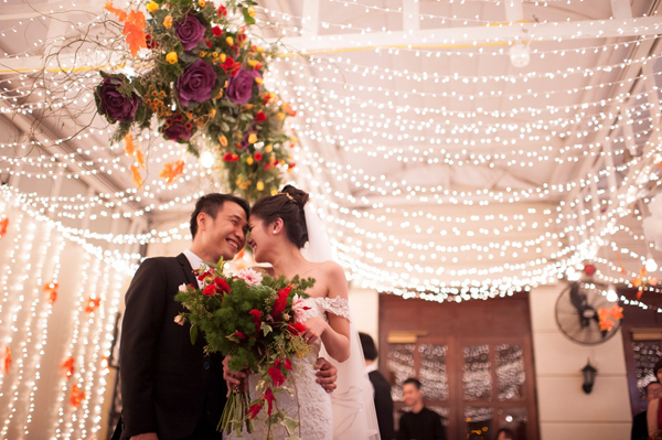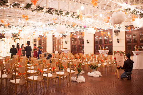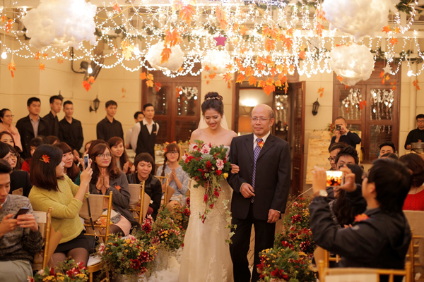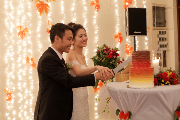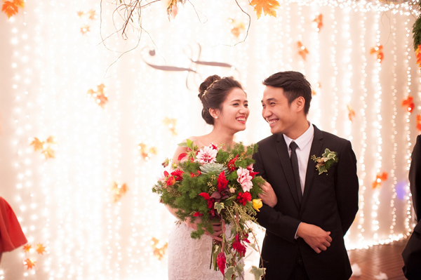 Từ khi còn là một cô bé, Hà Vân đã luôn mơ về một đám cưới chủ đề mùa thu với lá vàng rơi và ánh nắng ấm áp. Sẵn có chuyên môn về trang trí tiệc cưới, cô chỉ mất 2 tuần để chuẩn bị từ A - Z cho ngày trọng đại của mình.