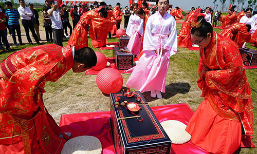Tuần vừa qua tại Trung Quốc diễn ra sự kiện đám cưới tạp thể của 66 cặp đôi, được tổ chức theo nghi lễ đám cưới của thời nhà Hán, cách đây với hơn 2.000. Họ cùng nhau thực hiện các nghi thức như rửa tay, uống rượu, cắt tóc,...