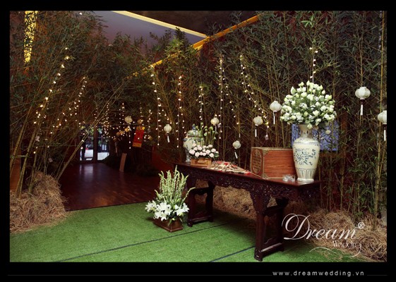 Cô dâu sinh sống tại nước ngoài từ nhỏ thế nhưng lại rất thích những phong cảnh hữu tình của làng quê truyền thống Việt Nam. Trở về Việt Nam tổ chức đám cưới, với ông xã và các bạn bè từ nước ngoài về nên cô dâu và mẹ cô dâu muốn trang trí tiệc cưới theo chủ đề Việt Nam xưa để giới thiệu nét đẹp truyền thống đến bạn bè quốc tế. Nhận được yêu cầu thiết kế tiệc cưới lần này, Dream Wedding cũng rất háo hức, nhưng cũng rất lo lắng vì phải đi tìm những vật dụng đặc trưng truyền thống của Việt Nam, lại mang vào khách sạn 5 sao sang trọng, làm thế nào để hài hoà được yếu tố truyền thống và hiện đại? Thế nhưng, chúng tôi cũng đã quyết tâm để tìm cho bằng được hàng trăm cây trúc tự nhiên, hàng trăm lồng đèn được nhập từ hội an, gần 70 bình gốm sứ được đặt riêng theo kiểu dáng, màu sắc mong muốn nhập từ Hà Nội vào, cho đến tìm những bàn ghế cổ... để mang đến một đám cưới như trong mơ ước của Susan và mẹ cô dâu.