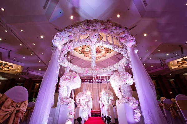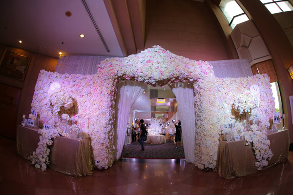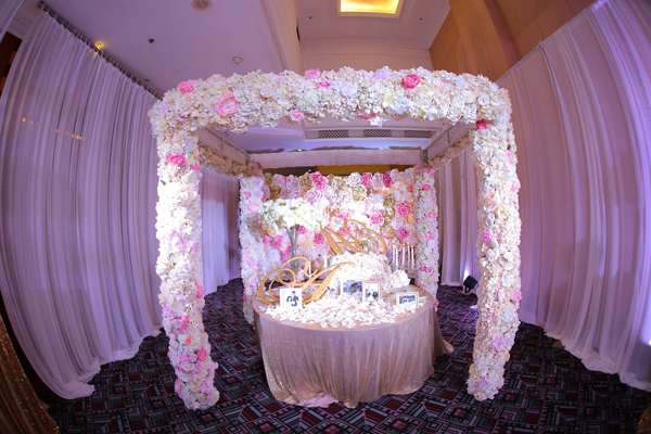 Đường dẫn lên sân khấu nổi bật với trụ lớn bọc kín hoa.