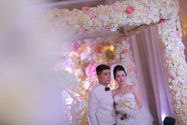 Tiệc cưới được tổ chức tại một khách sạn 5 sao ở Hà Nội với tông trắng - vàng nhũ chủ đạo.