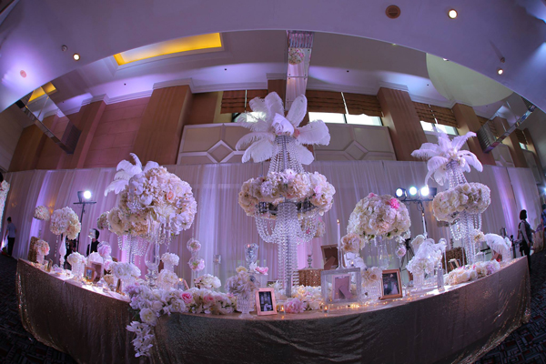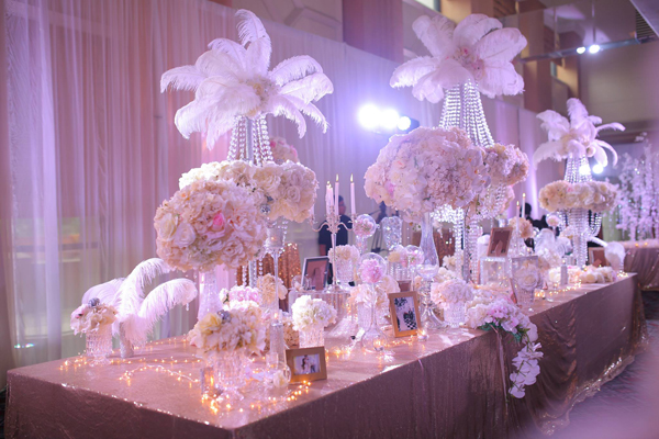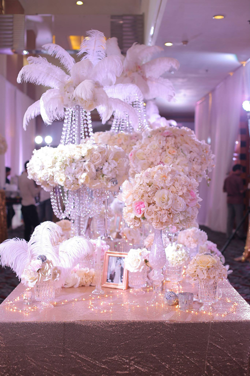 Khu vực đón khách "ngập" trong hoa tươi và những trụ lông vũ cao hơn 1m. Khăn trải bàn sequin tạo hiệu ứng bắt sáng đặc biệt.