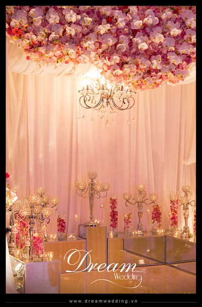 Lối đi được trang trí với những đôn hoa tươi cao thấp đặt trên đôn kính và cánh hoa hồng dọc lối lên sân khấu