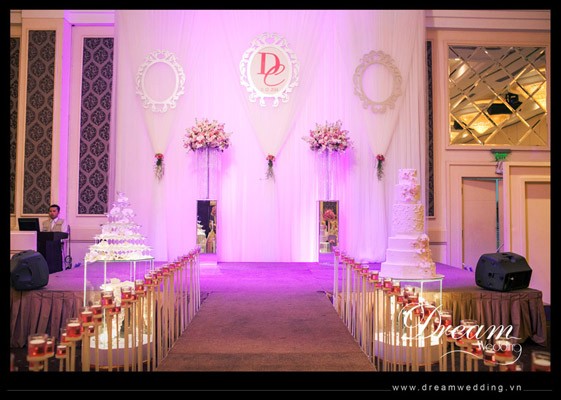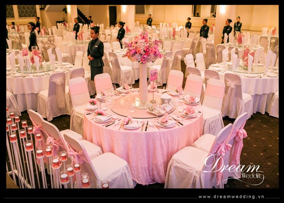 Tổ chức tại trung tâm hội nghị tiệc cưới White Palace, đám cưới Thái Dân & Kim Châu được Dream Wedding thiết kế trang trí dựa trên tông màu chủ đạo hồng pastel kết hợp với trắng tạo nên không gian buổi tiệc thật ấm cúm và lãng mạn. Sau đây là hình ảnh trang trí trong đám cưới:
