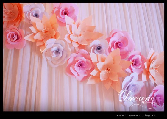 Hoa giấy được đính trên phông khu vực bàn bánh